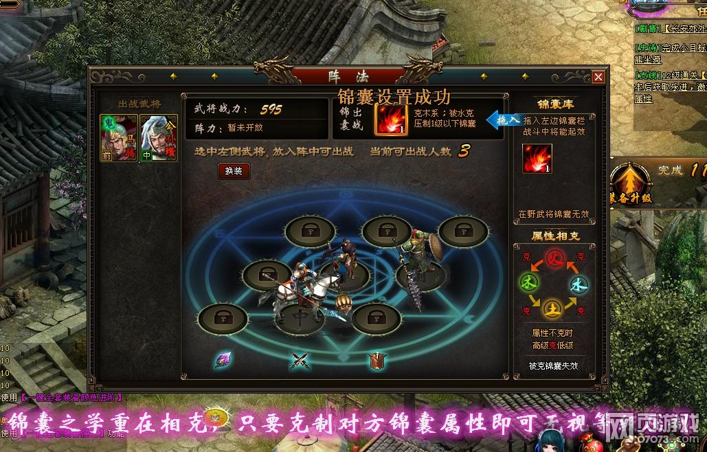 战斗操作:《我的三国》的战斗为自动回合战斗方式,所以决定战斗结果的除了队伍中角色品质和装备外就是玩家队伍的布阵策略。玩家20级后布阵最多可有5个武将同时上场,游戏中武将属性类型不尽相同,每个三国武将都有自己相对应的阵位,每个武将都只能放在自己阵法中相应位置上。如果加入军团后学习军团技能,不同军团技能对不同阵位上放置的武将有特殊属性加成可令战斗事半功倍。