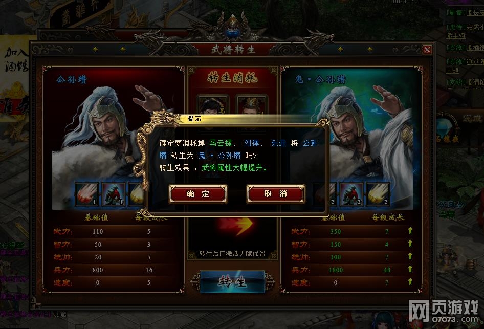 角色养成:本作在角色养成方面分为装备强化、武将转生两大部分。装备强化包括消耗强化石强化、通过洗练石洗练、镶嵌宝石合成等方式来提升装备各项属性。而武将转生则是本作玩法的一大特色,首先要激活武将,通过关系武将可将其激活,如果该武将为鬼武将,那么关系武将也必须是鬼武将。然后消耗关系武将使该武将转生,属性大幅度增加战斗属性激增。而且凡是蓝色品质以上的武将都有锦囊技能,在布阵中添加武将技能使队伍如虎添翼。