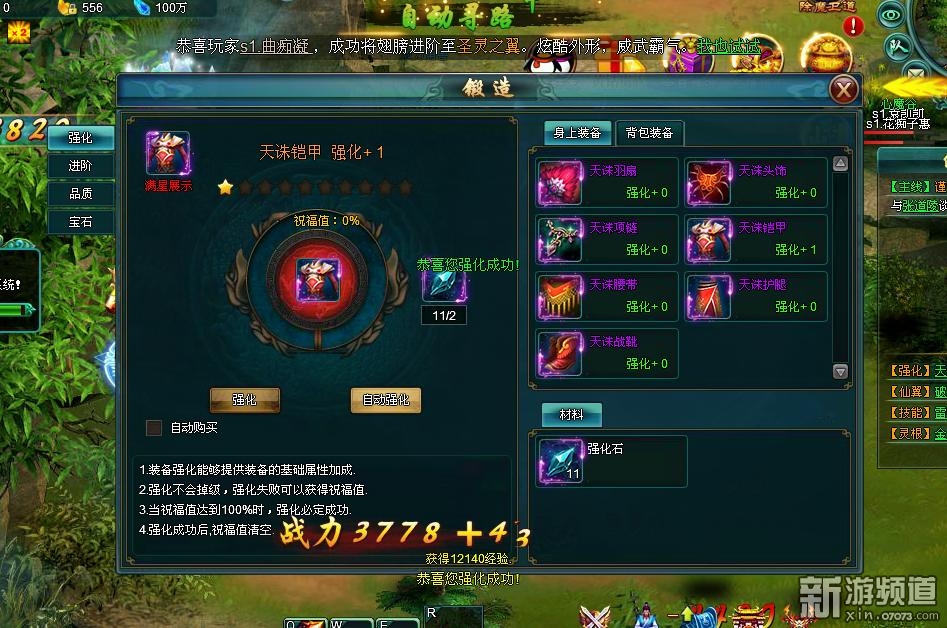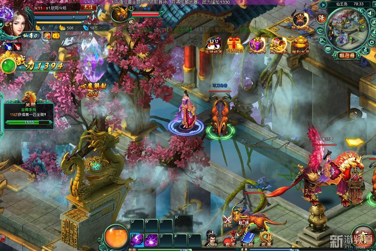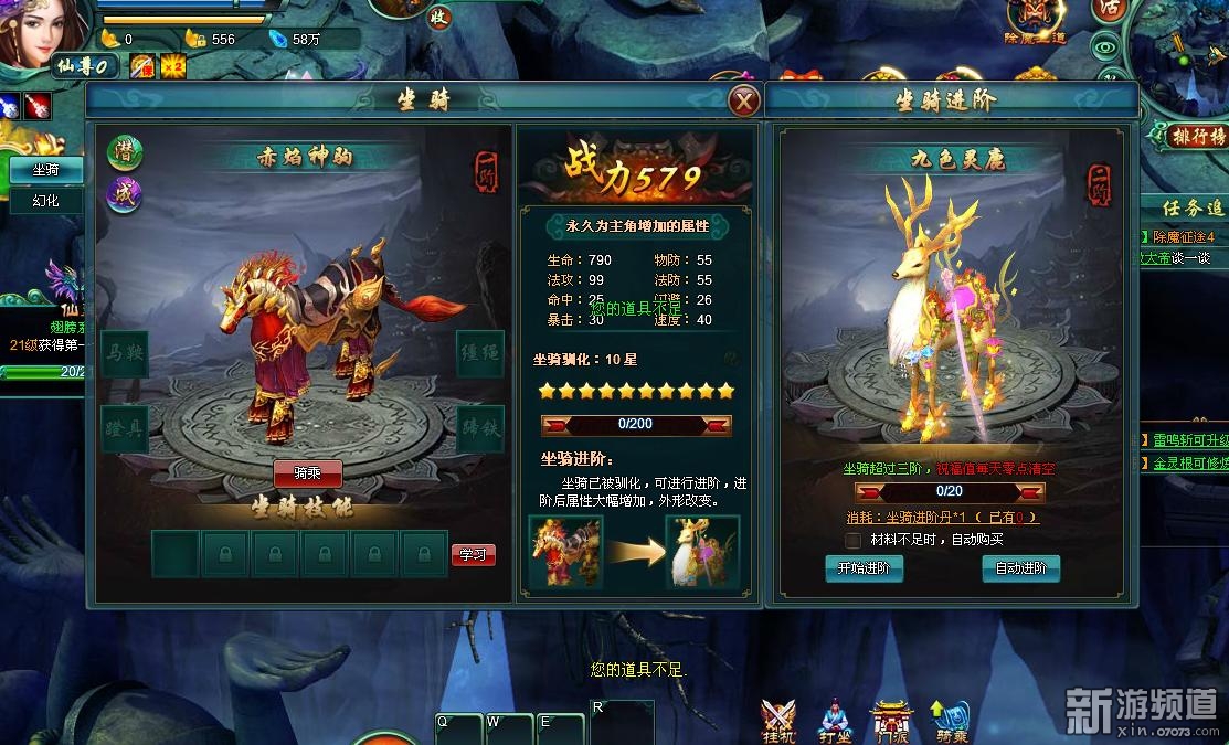 角色养成:游戏在角色养成方面主要有装备强化、角色成长和附属加成三方面。装备强化可增加装备基础属性加成,强化有失败几率但不会掉级。角色成长中,消耗仙翼进阶丹使仙翼进阶不仅外观更绚丽,而且玩家的生命、攻防、法术、命中、闪避、暴击等属性都有增强为玩家提供强大战力。坐骑神宠也为玩家附加不少属性,消耗坐骑进阶丹进阶坐骑不仅为坐骑增加多项属性,还可增强玩家战斗力一举两得。