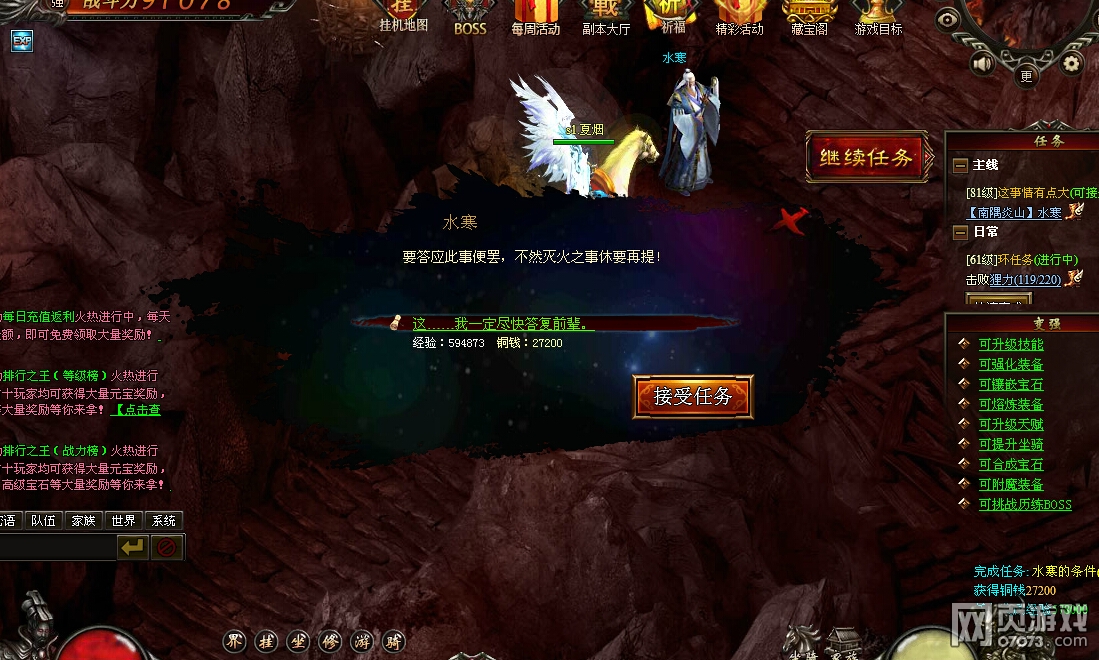 任务引导:《刀刀烈火传》的任务主要有主线任务,支线任务和每日跑环任务。主线任务与剧情和系统功能的开启紧密结合,目的是让玩家在前期成长的同时完成对游戏的了解;支线任务则是进一步的引导玩家提升实力,如装备强化、炼制宝石;跑环任务能获得大量的经验与铜钱,是中后期升级的基础。游戏的引导功能简洁实用,只要点击右侧对应的任务就可以快捷的自动寻路与自动挂机,每当有新功能、系统开启时,就会以动态的标注方式指导玩家体验。另外游戏中还有不少贴心的小功能,如右上角的屏蔽他人功能,可以避免人多时的混乱与卡顿;左下角的几个快捷按键,可以方便的切换一些功能:上下坐骑、挂机或手动、隐藏或显示界面等,非常方便。