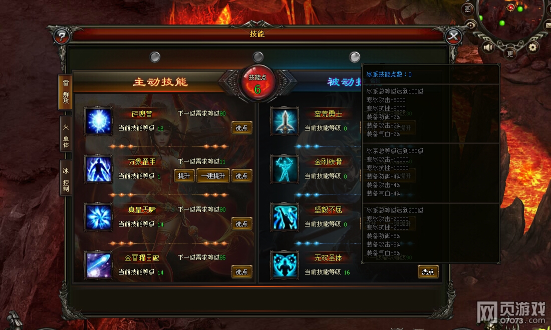 特色玩法:相信看到这里的玩家们都有了些许疑惑,小编怎么还没介绍技能系统呢?没错,正是因为《刀刀烈火传》的技能玩法很有特色,小编才会在这里为大家详细介绍,本作的技能伤害分为三大系列,每个系列有4个主动技能和4个被动技能,对应雷、火、冰三个属性伤害,而且雷系技能偏向群攻,是刷怪流的最爱;火系技能偏向单伤,是单挑BOSS不二的选择;冰系技能偏向控制,最适合战斗PK,玩家可以根据需要及偏好来选择加点套路。当然加错了也没有关系,自带的洗点功能只消耗少量铜钱,是不是很实惠呢?此外飞升玩法也是游戏的特色之一,但需要角色达到200级才能开启,小编暂时无缘接触,就需要玩家们自己在游戏中体验了。
