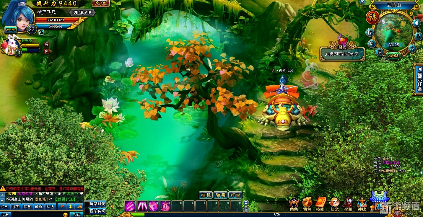 画面风格:《幻将西游》是一款2D卡通画风的游戏,画面清新自然,虽然以西游故事情节为背景,但场景和人设并没有多少神话题材的玄奇特点,反而是休闲、欢快的气氛更浓郁一些,不仅场景色彩鲜艳明亮、人物造型可爱无邪,连怪物也多以萌柔可人的形象出现,整体画风非常统一。本作的地图数量很多,但野外场景区别不大,组成元素都是草地黄土绿树,背景单一容易产生审美疲劳。游戏的UI界面比较简洁整齐,系统提示和快捷按键都整齐的排布在技能栏的正上方,右上方的活动图标也能点击隐藏,给人以清晰干净的观感。