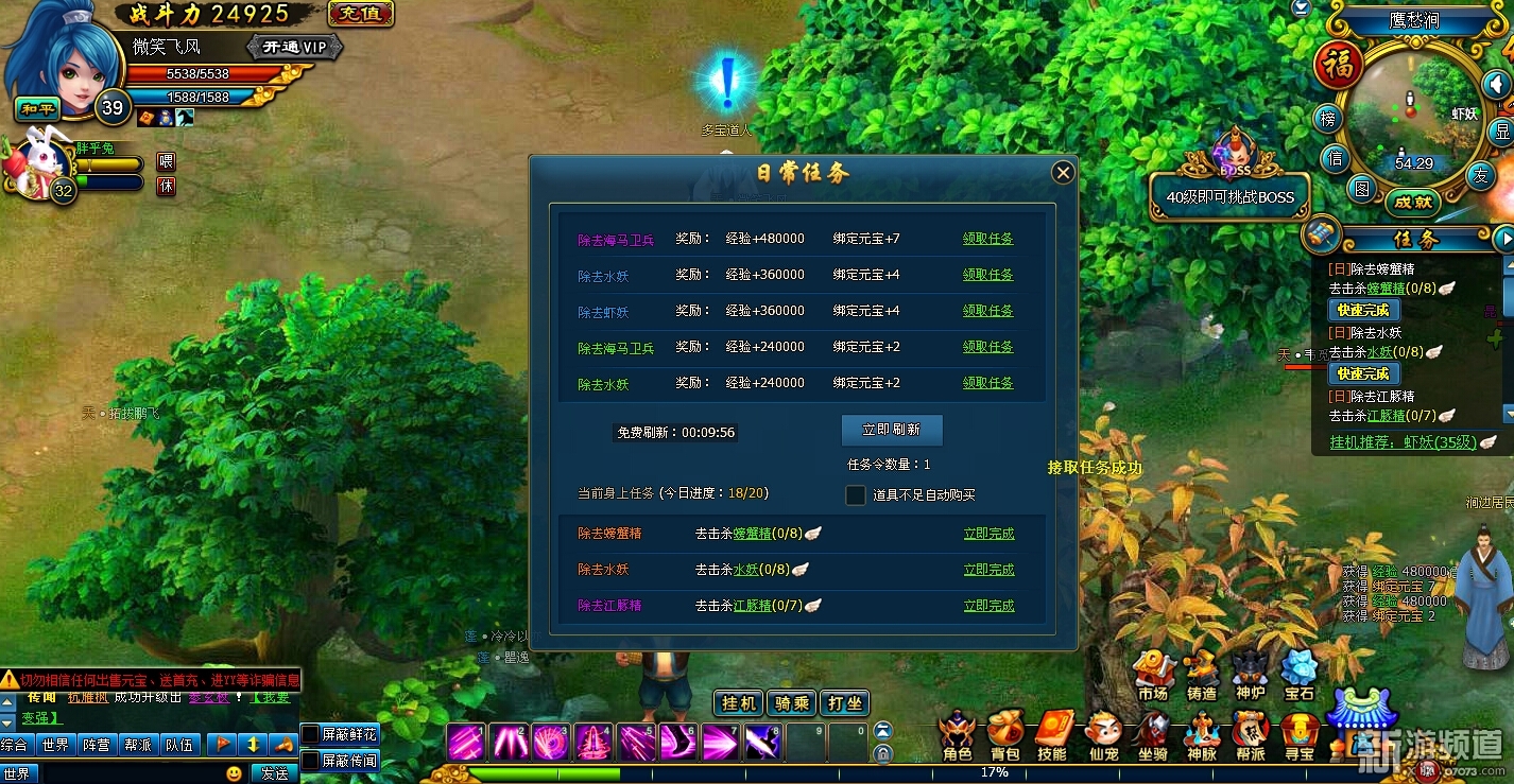 任务引导:游戏在创建角色时就需要选择职业与势力,势力分为蓬莱、天山和昆仑,因为只有相同势力才能加入同一帮派,所以一起玩耍的小伙伴们要注意这一点。职业共有3种,近战肉盾的卧虎、远程输出的雨天、近战爆发的修罗,都是很常见的职业设定,可以根据自己喜好选择。《幻将西游》的任务类型很多,除了基本的主线任务外,还有日常任务、补天任务、护送任务等,任务等级可以刷新,奖励大量经验,光是做任务就可以满足每天的升级所需。