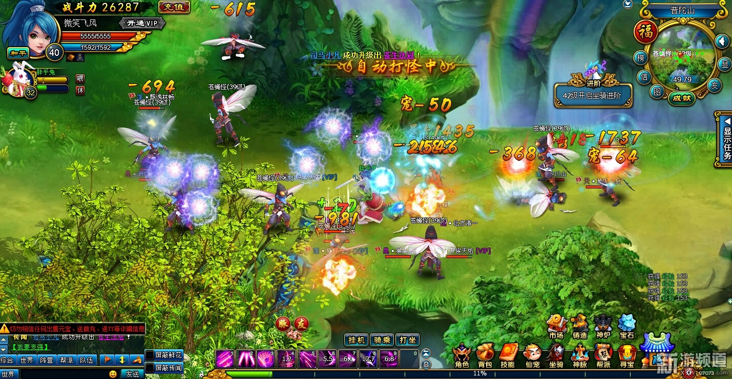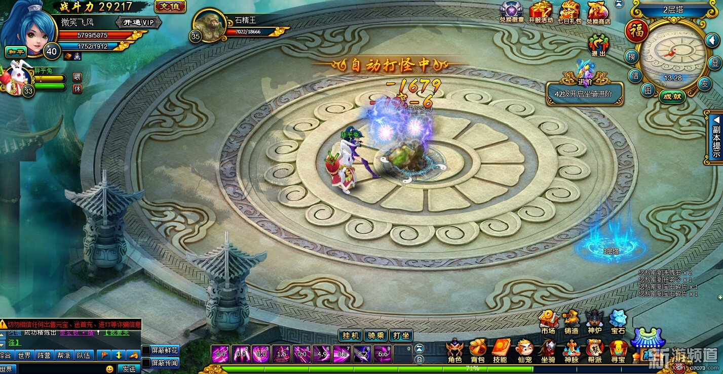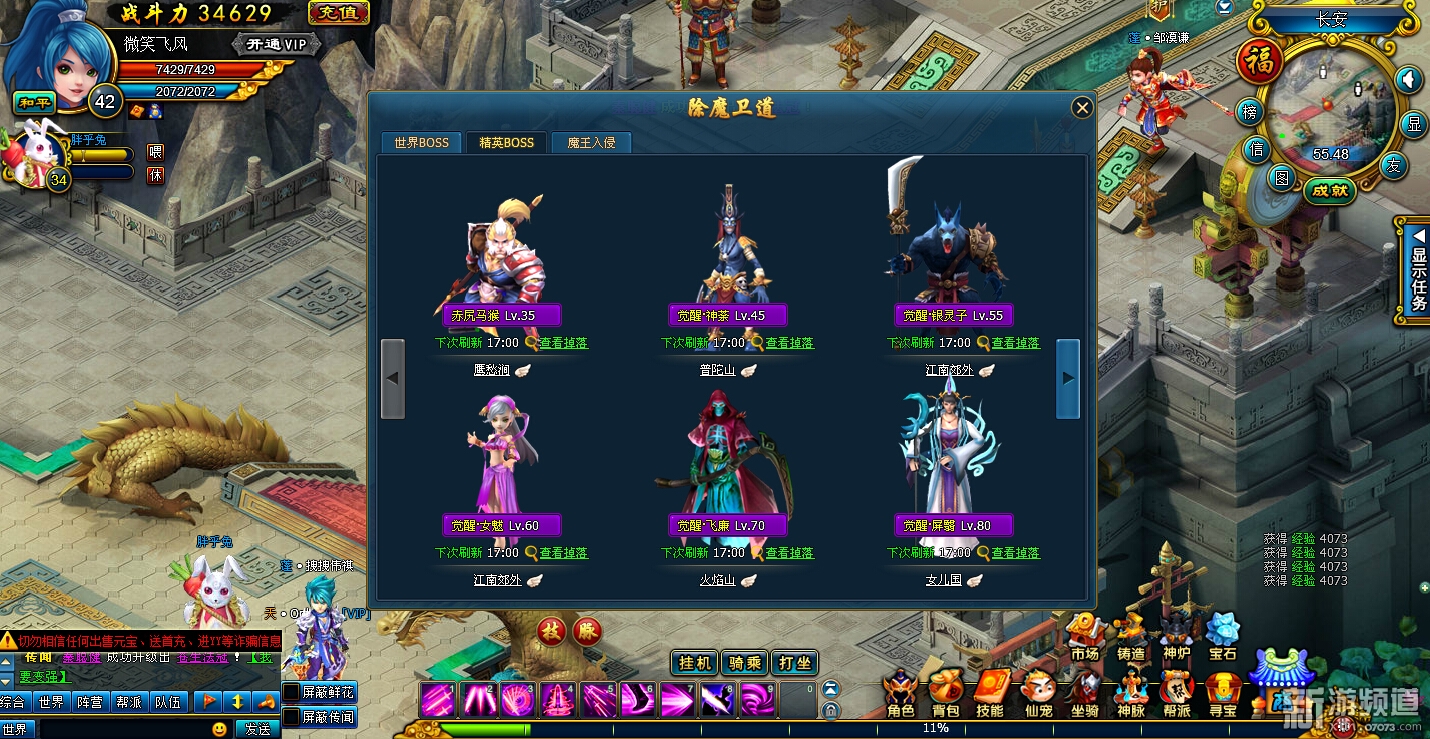 副本活动:除了各类的任务外,《幻将西游》的副本种类也很齐全,副本有5种,包括经验副本、宠物副本、装备副本、防守副本和铜币副本,每种副本每天都有一定的进入次数,45级开启扫荡功能后挑战就省事多了,可以轻松获得各种资源。游戏的限时活动目前不是很多,玩法也比较老套,除了除魔卫道外还有双倍护送、斗法战场、帮派战场3种,后两种有着明显的PK倾向;除魔卫道是刷BOSS的一个集中界面,包含了世界BOSS、精英BOSS和魔王入侵3种活动,都是按时刷新的。