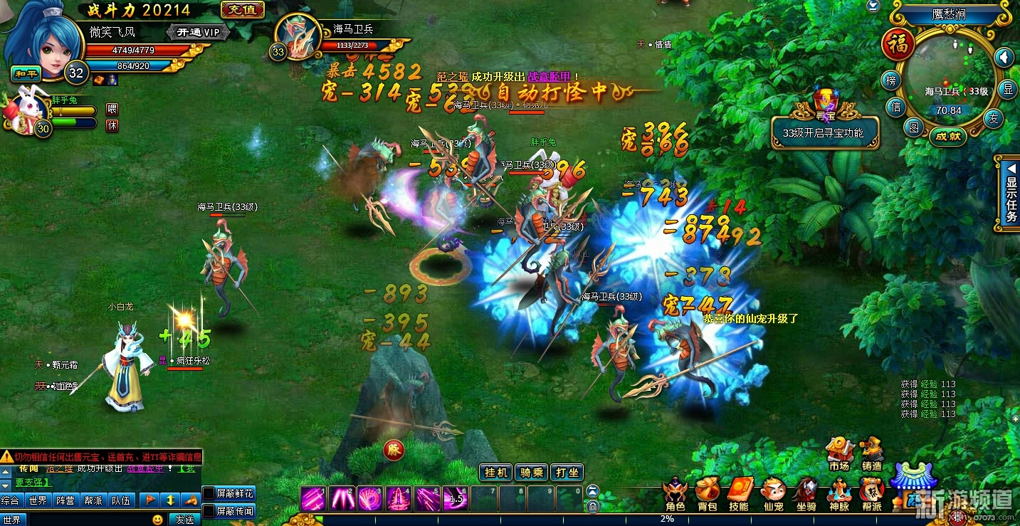 战斗操作:本作的战斗方式为即时制,鼠标左键点击地面进行移动,数字键控制技能释放,相比于其它的卡通画面游戏,《幻将西游》的战斗场面还算不错,一些BUFF和DEBUFF都有明显的特效显示,技能光效也十分华丽,给人以良好的战斗体验;而且轻功、突袭、控制等技能效果侧重于PK玩法,虽然站桩式打法不可避免,但多少也为逃跑、追袭等操作提供了便利。值得一提的是技能升级只消耗铜币,而且升级后的伤害大大增加,所以要及时的升级技能。