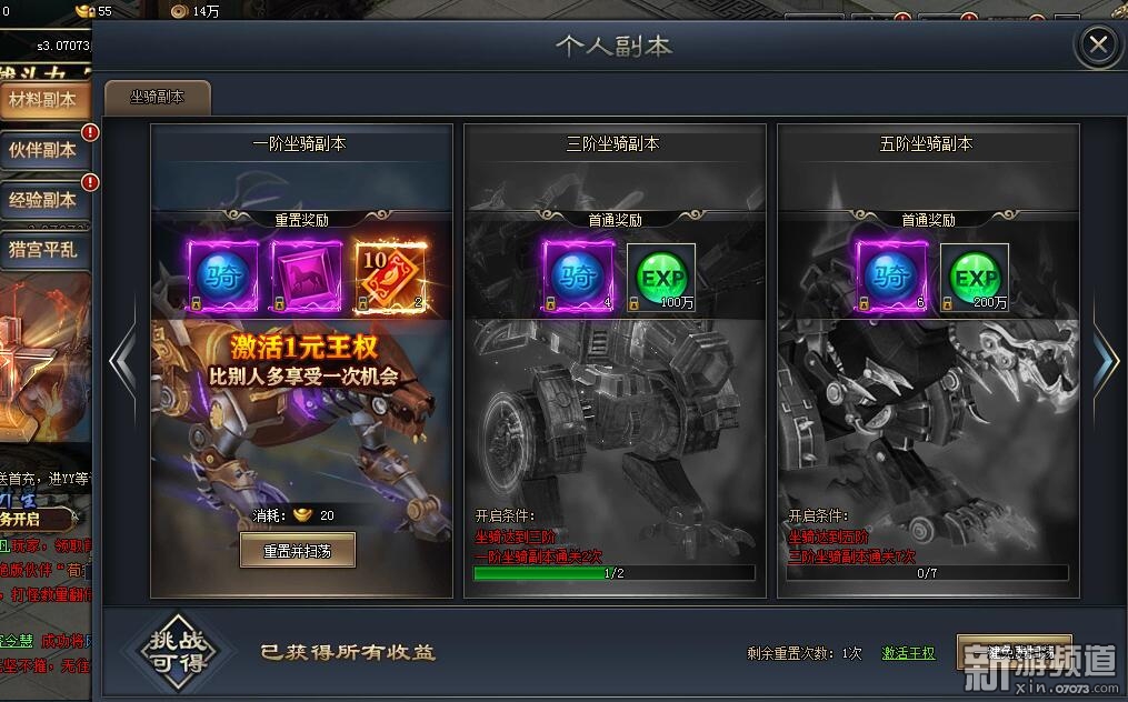副本活动:作为一款经典的RPG游戏,副本玩法当然是必不可少的。个人副本中包括材料副本、伙伴副本、经验副本与猎宫平乱。通过挑战副本不断获得坐骑、伙伴、武器等进阶所需的道具。副本挑战中不仅仅让你体验到了畅快厮杀的精彩快感,跟是根据不同的场景变化人物武器,让你对风起长林有一个更好的体验。