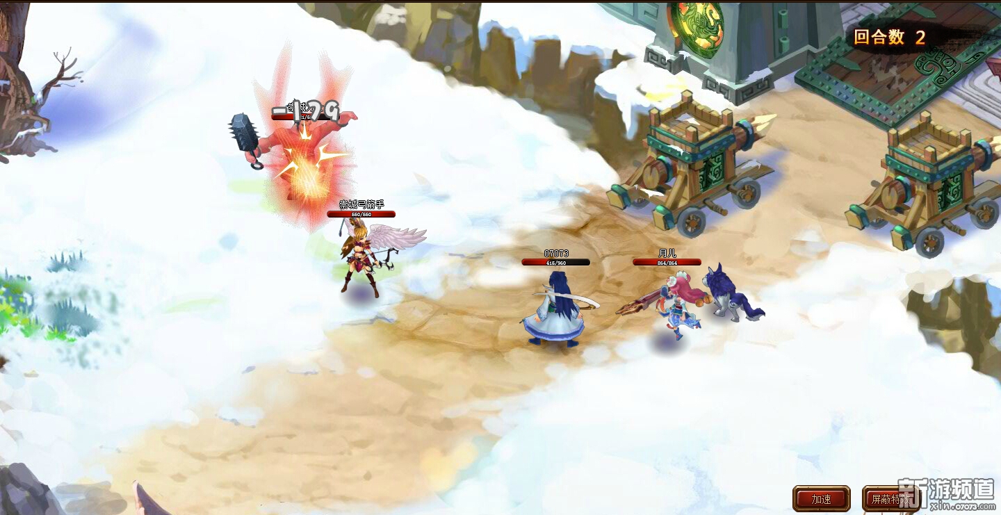 战斗操作:本作的战斗采用标准的自动回合制模式,进入战斗界面之后,玩家只能选择快进或关闭特效,无法对战斗结果施加任何的影响,当然,这种设计也侧面解放了休闲玩家的时间,还是比较适合页游节奏的。游戏中设计了神枪、御剑、修罗、天羽四种职业,并且在战斗开始前有布阵系统,但就前期的体验来看,无论是职业还是站位对战斗胜负的影响都不太大,敌人攻击目标是随机的,技能也多为单体,策略度稍低。