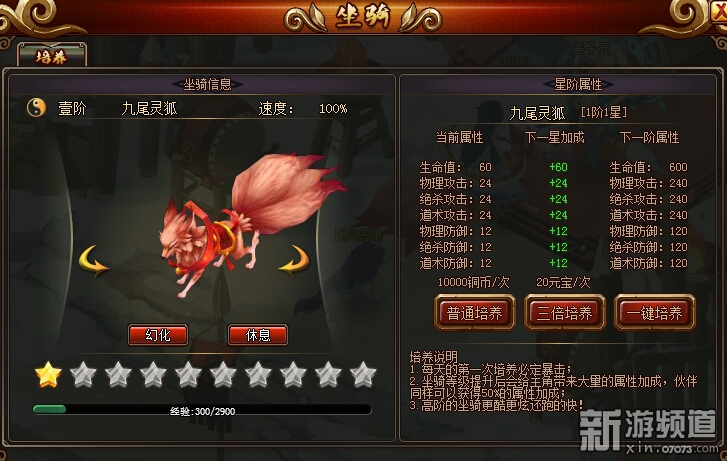 角色成长:游戏的成长系统以数值强化模式为主。除了页游必备的装备强化玩法之外,本作还为玩家准备了宠物培养和坐骑培养系统,宠物培养在一个单独的页面内实现,玩家可以在游戏过程中收集多种多样的宠物,选择适合本职业的出战并培养,宠物可以提升资质,也能够学习技能,后期看着草地上各种宠物奔跑跳跃也是蛮有趣的。坐骑培养分为普通培养、三倍培养等,属于休闲玩家和大R玩家的分界线,坐骑培养越高给玩家提供的属性增益就越高,培养到一定阶段后还可以幻化外形,不过时间有限,小编也没有看到后期高级别坐骑的威武样子,就留待玩家自己探索吧。