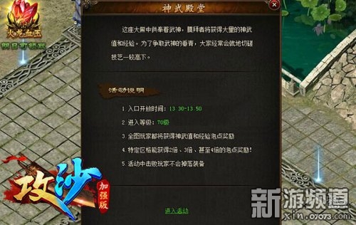 神武殿堂作为限时日常,每天的13:30-13:50为入口开放时间。玩家进入该地图后将获得神武值和经验泡点奖励,甚至在特定区格中,还能获得2倍、3倍、4倍泡点奖励!更加令人激动的是在活动死亡玩家不会掉落装备,可以尽情PK!