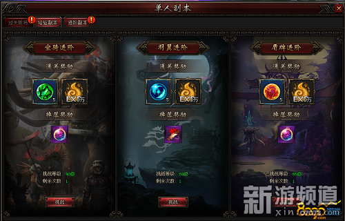 进阶副本中又分为三个副本玩法,分别是坐骑副本、羽翼副本和盾牌副本,是玩家获取坐骑、羽翼、盾牌系统进阶耗材的重要来源。玩家进入副本后,需击败副本中三个目标BOSS从而获取胜利。若挑战时间超过10分钟,则挑战失败。通关失败无奖励,也不会限制挑战次数。挑战成功后,即通过系统面板发放奖励,若背包已满则会发送邮件给玩家。系统每日24:00重置,玩家每天可免费通关一次,并通过元宝重置再通关一次。