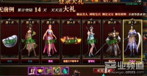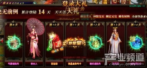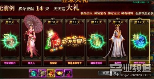 先看看第一天,除了10万银两还有2级宝石宝箱、培养石、一瓶攻击药水和5枚坐骑经验丹。再看傲天我是皇游戏中小编第七天的收获,除了美女李季兰,还可以收获200绑定元宝、五级宝石宝箱、8枚培养石以及25枚骑兵进阶丹。奖励不可谓不丰厚,这些都还是算最初的,越到后面奖励越多。不信我们打开第14天看一看就知道了。