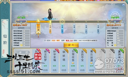 三转之前,每日完成兵藏洞天、前尘忆梦、妙华圣境、锁妖塔、日常任务、仙门任务、气运任务、龙宫寻宝、青丘运酒、瀛洲采药这10个任务,即可轻松将仙阶提升一整个档次!这里瀛洲采药需要1小时,可以留到最后,各种任务有20环可以自动做,青丘运酒每天18点开启双倍时间,所以你懂的! 等等,还没完事呢!51《三生三世》仙阶提升要经过初窥、身受、顿悟、小成、大成、圆满这六个境界,需要通过历劫才算完美!