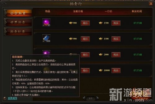 《传奇霸业》拍卖行,由公会拍卖行和世界拍卖行组成。当勇士挑战公会BOSS成功后,将随机挑选稀有道具,自动上架至公会拍卖行,公会成员可使用元宝参与竞拍,竞拍成功后,参与公会BOSS挑战的玩家,都能分得部分元宝奖励;当公会拍卖的道具流拍后,将自动进入世界拍卖行;竞价方式采用提前扣费的方式,若竞价被其他人超过,则立即返还竞价至个人。