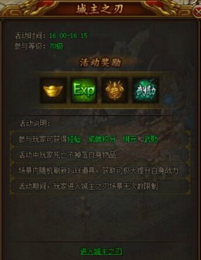 城主之刃活动是成就令牌的重要产出地,除此只外玩家还能获得绑定元宝、海量经验和武勋的丰厚奖励。城主之刃可在活动开启时间内,通过土城安全区域中心的城主之刃雕像进入。