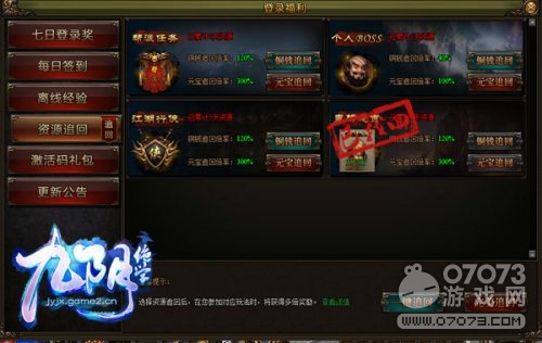 资源找回系统,能帮你找回包括帮派任务、个人BOSS、江湖行侠和皇榜悬赏一共4种日常任务的奖励,使用铜钱能够找回40%(每天)的资源,如果使用元宝进行追回则可以找回100%(每天)的资源。