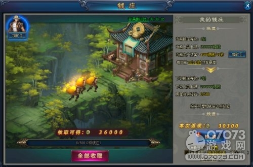 玩家可通过游戏主界面右下部的【钱庄】图标进入钱庄系统,如今KU25《绝世仙王》钱庄系统的功能已经非常完善,玩家可在界面可查看当前钱庄等级、存钱上限、生产效率、存满剩余时间等,各项功能一目了然,操作简单,十分便民。