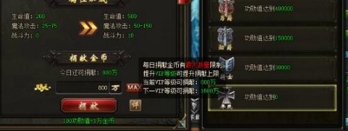 获得功勋值的方式是捐献金币,我们来看一看傲天魔域永恒捐献金币的一些详细解释。每日捐献金币有最大数量限制,提升VIP等级可以提升捐献上限。小编当前VIP等级可以捐献800万,也就是说一天可以累积到800的功勋。如果提升到下一等级,则可以捐献1600万,轻轻松松拿到1600的功勋,虽然离3万还有点远。