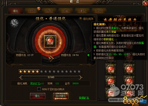 如果夜战比奇活动中你的表现不够给力,那么就来强化下你的装备吧,普通强化需要消耗金币和黑铁矿石,强化至15后需要极致强化,极致强化需要消耗金币和玄铁矿石。黑铁矿石可以通过采矿、材料副本、神秘商店以及商场购买。玄铁矿石则只能通过神秘商店和商场购买。不过普通强化和极致强化都有一定几率失败,但是极致强化失败会降级,玩家可通过消耗元宝保护不掉级。