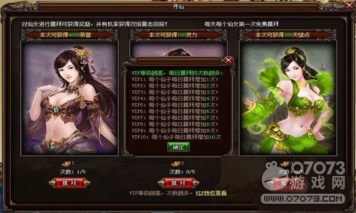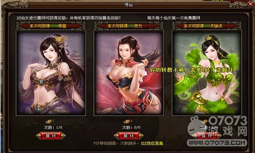 萝卜玩《烈火战神》中的玩家们每天对每个仙女各膜拜5次,即每天共膜拜15次。但是如果你是VIP用户的话,那么次数也是随之增加。VIP3可以每个仙女多膜拜3次,而VIP4则是每个仙女多膜拜4次。在寻仙系统中,第一次膜拜每个仙女是免费的,之后每次都要消耗元宝。