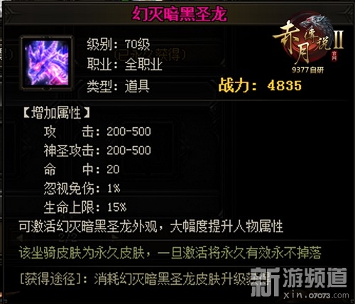 玩家在游戏里佩戴9377《赤月传说2》幻灭暗黑圣龙可激活对应外观,并大幅度提升人物属性,且该坐骑皮肤为永 久皮肤,一旦激活将一直有效不会掉落。