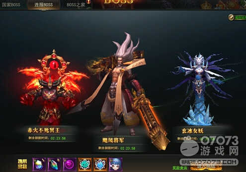 国家BOSS:玩家每达到一定等级时,可进入新场景中寻找国家BOSS,通过击杀国家BOSS获取武器打造材料。国家BOSS有几率掉落稀有武器、天将。国家BOSS每三个小时刷新一次。