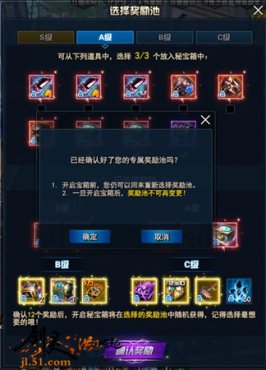 海量珍稀奖励划分为S、A、B、C四个等级。S等级可挑选2个奖励,A和B级可分别挑选3个奖励,C级可挑战4个奖励。玩家使用秘宝钥匙可以从挑选的12个奖励中随机抽取奖励,已经抽取到了奖励不会再被抽中,最多12次即可抽取全部挑选的奖励。奖励池奖励可任意选择,在开启第一个秘宝箱前仍可重新选择奖励。最多开启12个秘宝箱,活动后将会开启秘宝箱钥匙回收功能,回收多余的秘宝箱钥匙,背包满时请在邮件查看奖励。