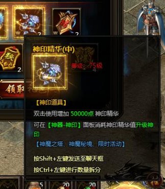 神印精华(中)。双击使用增加50000点神印精华。可在【神器-神印】面板消耗神印精华值升级神印。