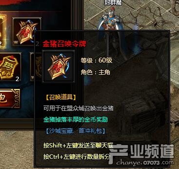 金猪召唤令牌。可用于在盟众城召唤出金猪。金猪掉落丰厚的金币奖励。
