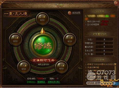 每天最多可以完成3次修炼任务,完成修炼任务可以获得飞升丹,一天最多可以获得30个飞升丹,每一个飞升丹可以增加1点五行修炼,每10个飞升丹可以修炼一次,会随机增加一个元素的修炼,每个元素最多转到13次,就不会再转到。直到5个元素全部修炼满即可完成最终的飞升。