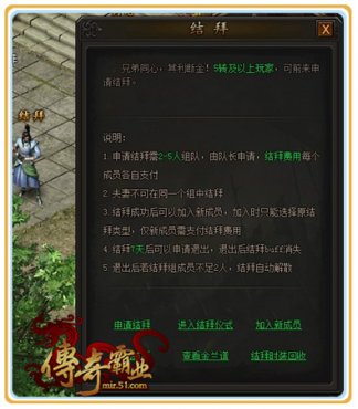 少年热血,交结五方雄。肝胆洞,毛发耸。立谈中,死生同,一诺千金重。你是否还记得,从银杏小村出发,在僵尸洞不打不相识的兄弟?踏过沃玛森林、祖玛阁、石墓七、直至君临沙城成为传奇主宰。岁月匆匆十七载,风雨牵挂霸业宏图,陪伴一生戎马,是生死好兄弟。而今,51《传奇霸业》结拜系统奏响号角,曾经的兄弟,此时不归,更待何时? 苍天在上,厚土在下,今日我愿与你结为异姓兄弟,从此有福同享,有难同当,此言此誓,日月共鉴。