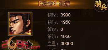 孙策的基础属性,武将资质达到了37,这在金将里是算中等的,定位的骑兵,而他的物攻、物防、血量都比较一般,当然这是和其他的金将进行对比,总体来说算是中规中矩的金将!