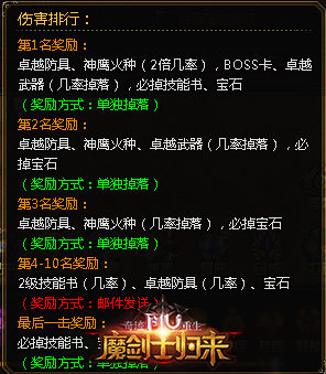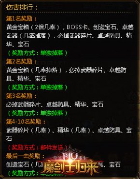 一个需要各大服务器玩家共同面对才有可能击败BOSS带来的奖励当然会是最丰厚的。榜上有名的玩家能够直接通过奖励的各种“装备箱”开出极品装备,而完成最后一击的玩家还将独享一份“终结奖奖励”独自带走一个装备箱哦!塔人《奇迹重生:魔剑士归来》官方网站:mu2.zhaouc.com