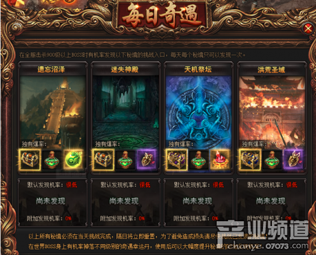 在全服击杀900级以上的BOSS有几率发现遗忘沼泽、迷失神殿、天机祭坛和洪荒圣城秘境挑战入口,每天每个秘境只可以发现一次哦!难怪叫每日奇遇,玩家们赶快来奇遇你的秘境吧!听说世界BOSS身上有几率掉落不同级别得奇遇幸运丹,使用后可以大幅度提升秘境的附加发现几率哦!