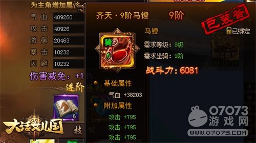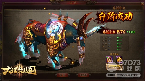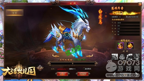坐骑界面下方会有[进阶]和[自动进阶]两个按钮,玩家需要积攒一定数量的坐骑进阶丹才可使用它们。坐骑每成功进阶都可获得更高战力,更酷炫的外型;坐骑阶数越高,所能使用属性丹的数量也越高。升阶采用祝福值模式,祝福值越高,进阶成功概率越大,当积累一定祝福值后,白龙马会蜕变成为2阶的独角青牛,战斗力瞬间增加1050,同时还可额外获得坐骑进阶丹和绑定元宝,非常实惠。