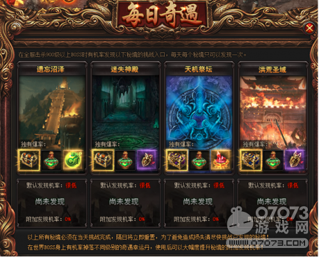在全服击杀900级以上的BOSS有几率发现遗忘沼泽、迷失神殿、天机祭坛和洪荒圣城秘境挑战入口,每天每个秘境只可以发现一次哦!难怪叫每日奇遇,玩家们赶快来奇遇你的秘境吧!听说世界BOSS身上有几率掉落不同级别得奇遇幸运丹,使用后可以大幅度提升秘境的附加发现几率哦!