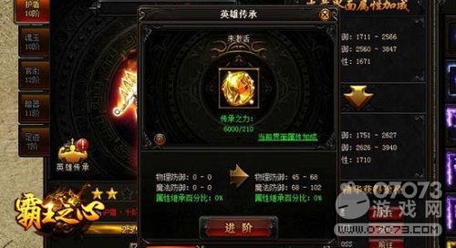 英雄传承是9cb《霸王之心》宝物系统中的一个全新玩法,玩家角色的护盾、魂玉、官衔、暗器四种宝物可以通过英雄传承,将属性按一定的百分比转换到自己的英雄身上。