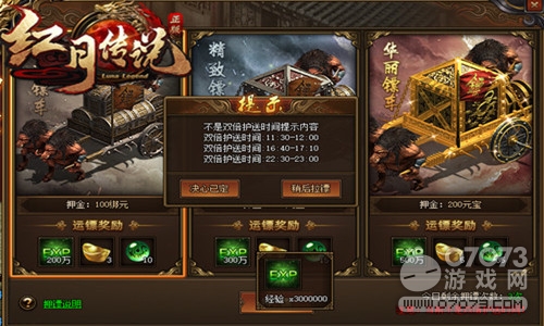 51《红月传说》押镖成功运送后返回押金,镖车运达目的地有丰厚的奖励,越高级镖车奖励越高也越抗打,镖车被打爆后会掉落购买时的货币,最重要的是双倍时间段运送会有双倍奖励,双倍的时间上面已经发给大家,不记得也没关系游戏内有提醒。