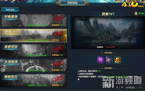 43u《武动乾坤》中定时活动除了跨服1v1、封魔秘境、乱斗5v5,还有历练峡谷、阳元矿脉、镖局风云、三倍击杀、元宝总动员、海底寻宝、太清仙池等定时活动哦!玩家们只管锁定好时间尽情体验吧!