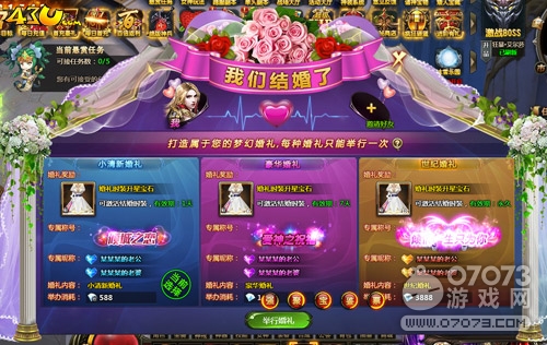 盛大婚礼可是爱情的象征,在43u《魔法风云纪》中举办世纪婚礼可以获得婚戒升品石、爱情果实和甜蜜礼盒。只有已婚的玩家可以举行哦!奖励的时装激活道具会通过邮件的方式发送,每种婚礼每次婚姻关系只能举行一次,夫妻双方共享举行次数。