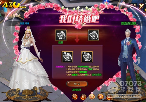 在43u《魔法风云纪》中点击我要结婚就可以传送到爱情大使处,在爱情大使处可以选择领证结婚、举办婚礼、举办酒宴和离婚。结婚需要双方为异性好友且达到62级,双方必须拥有爱情戒指,双方亲密度达到99以上。如果双方是同性的话还花费288钻石购买变性卡还可以为爱变性哦!