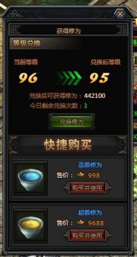 超级修为使用也是有等级限制的,限制等级为80级。打开就能获得500000修为,但与高级修为相比,每日限购只有10次,获得修为累积到一定量后,就能在【角色-转世】面板通过消耗指定的修为来提高转世等级。目前产出途径也只有活动奖励和快捷购买两种途径。