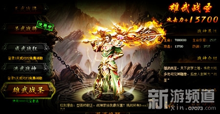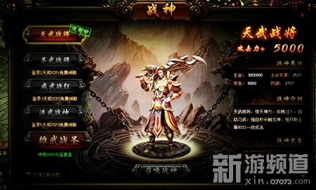 玩家们到达60级后才能打开战神系统的界面,战神分为五个等级,等级越高,拥有的属性就越强。分别为:天武战将、圣武战将、威武战狂、洪武战神、雄武战圣。他可以帮助玩家攻击怪物,加快打怪效率,但是不能参加pk活动,攻击玩家。