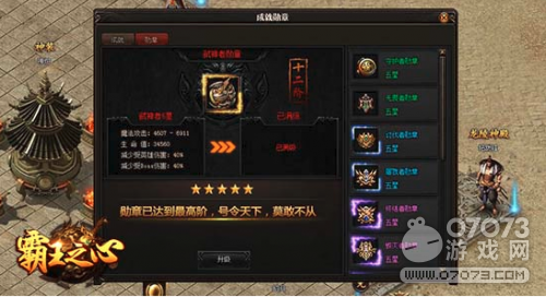 《霸王之心》的成就分支下,总共可达成成就多达千种以上,每种成就均可获得成就点与金币奖励。通过积累成就点,可以提升玩家的勋章等级,目前版本中勋章共有十二阶,每阶分为五星,升级勋章后可以大幅提高玩家的攻击力、生命值,减少受到玩家、BOSS伤害等等。成就与勋章的成长都是终身有效,永不消退!