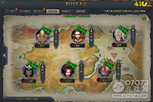 达到相应的等久就可以挑战43u《斗罗大陆》BOSS大厅的个人BOSS,这里会刷新熔血巨蟒、蝠翼恐魔、蓝炎巨石兽、玄天钢狼鹫、兽王星晶牛、捌雷影兽、地狱焰首兽、转日裂牙兽、噬魂摄气牛等BOSS,想要挑战更高等级的BOSS就先努力升级吧!