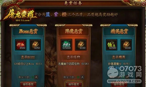 悬赏任务也是升级重要途径,悬赏任务主要包括精英悬赏、BOSS悬赏以及降魔悬赏,顾名思义,所谓精英悬赏,指的是目标全是精英BOSS,BOSS悬赏的目标全是BOSS,降魔悬赏的目标是特定地图的怪物,难度都不是很大。每种任务每天都有次数限制,一定要将所有次数都用掉,毕竟给的经验非常多。除了经验还能得到特定的奖励,如精英BOSS会得到命符碎片奖励,降魔悬赏可以得到武勋奖励,BOSS悬赏能得到精血奖励,精血可以提升神龙血脉,武勋能提升我们的头衔,命符能提升属性,这些都能提升我们升级的效率。
