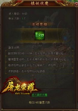 当等级达到要求之后,在个人成就界面中可以领取到经验丹,前期而言,经验丹的奖励非常丰厚。镇妖伏魔活动也要注意参与,这个活动规则简单,就是不断击杀一波波的怪物,击杀的波数越多,奖励越丰厚,每天有三次的机会,每次的时间是十分钟,在活动场景中可以召唤出雷霆法师以及玄冰法神,他们的攻击力很强悍,且都是范围杀伤,对我们的助益很大。召唤法师与法神需要相应的令牌,令牌在很多活动中都有掉落,如果没有,可以花费绑定元宝购买,不要心疼元宝,所收获的经验奖励绝对物超所值。