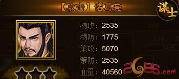 在招募到郭嘉、周瑜、刘备这三名武将的时候,可以激活谋定天下、终生对手、三顾茅庐情谊属性,物防、策防策攻都可以得到20%的提升。作为一名纯输出的武将,诸葛亮有着十分强大的技能,并且自身资质达到最高的39,保证了他极高的成长。