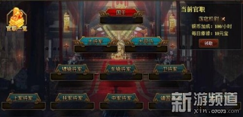 在百将天下国家功能中,有着十分完善的官职系统,从荡寇校尉→中军、镇国、镇军、上军将军→骠骑、车骑、卫将军→大将军、大司马→国王层层递进,能够享受到的特权都不同,成为过往之后就可以号令群雄参与国战,享受多种特权和加成。游戏内的国王一位向来是有能者居之,只要自己能够在对战中打赢国王,便可取而代之,但这可并不是一件简单的事,毕竟能当上国王的人都是有两把刷子的,我们需要做的就是不断的提升自己实力,厚积薄发之中,决胜千里之外。