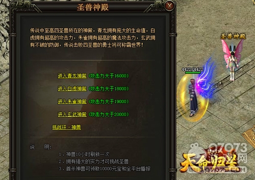想要获得众多道具就来51《铁血皇城》圣兽神殿挑战神兽吧!神兽10小时刷新一次,拥有强大的实力才可以挑战圣兽哦!青龙拥有庞大的生命值,白虎拥有超高的攻击力,朱雀拥有超高的魔法攻击力,玄武拥有不破的防御,击败四圣兽的勇士将可称霸世界!小火伴们赶快行动起来吧!是时候证明你的实力啦!