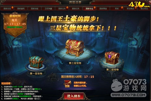在43u《龙之女神》中,国家夺宝会在每天的15:00-21:00开启,副本共分为3层,每天的17:15-17:45是国家任务怪物虚弱时间,这时候的怪物生命值下降10%,每层终点有一个宝箱,宝箱每人每天只能领1次。